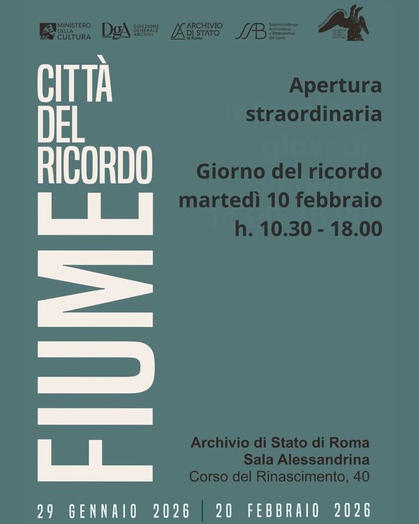 Di particolare rilievo storico, inoltre, è la mostra documentale (che resterà aperta sino al 20 febbraio) Fiume la Città del Ricordo, con documenti e cimeli dell’ Archivio-Museo Storico di Fiume: organizzatori, l’Archivio di Stato di Roma e la Società di Studi Fiumani, all’Archivio di Stato dell’Urbe in Corso Rinascimento,40 (Sala Alessandrina, c𝗼𝗻 𝗶𝗻𝗴𝗿𝗲𝘀𝘀𝗼 𝗹𝗶𝗯𝗲𝗿𝗼 𝗱𝗮𝗹 𝗺𝗲𝗿𝗰𝗼𝗹𝗲𝗱ì 𝗮𝗹 𝘃𝗲𝗻𝗲𝗿𝗱ì, ore 𝟭𝟰.𝟬𝟬-𝟭𝟴.𝟬𝟬).